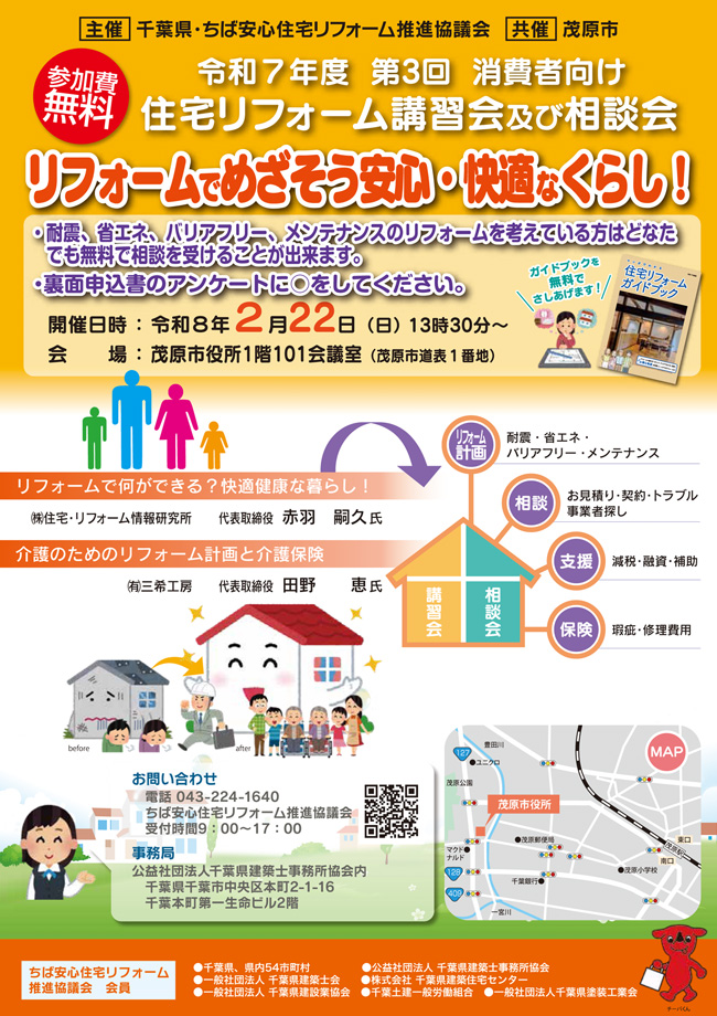 ちば安心住宅リフォーム推進協議会では、良質なリフォームを推進するための様々な活動を行っています。その一つに、消費者向け講習会、事業者向け講習会を開催しています。 これまでの講習会の広報フライヤーをご紹介します。