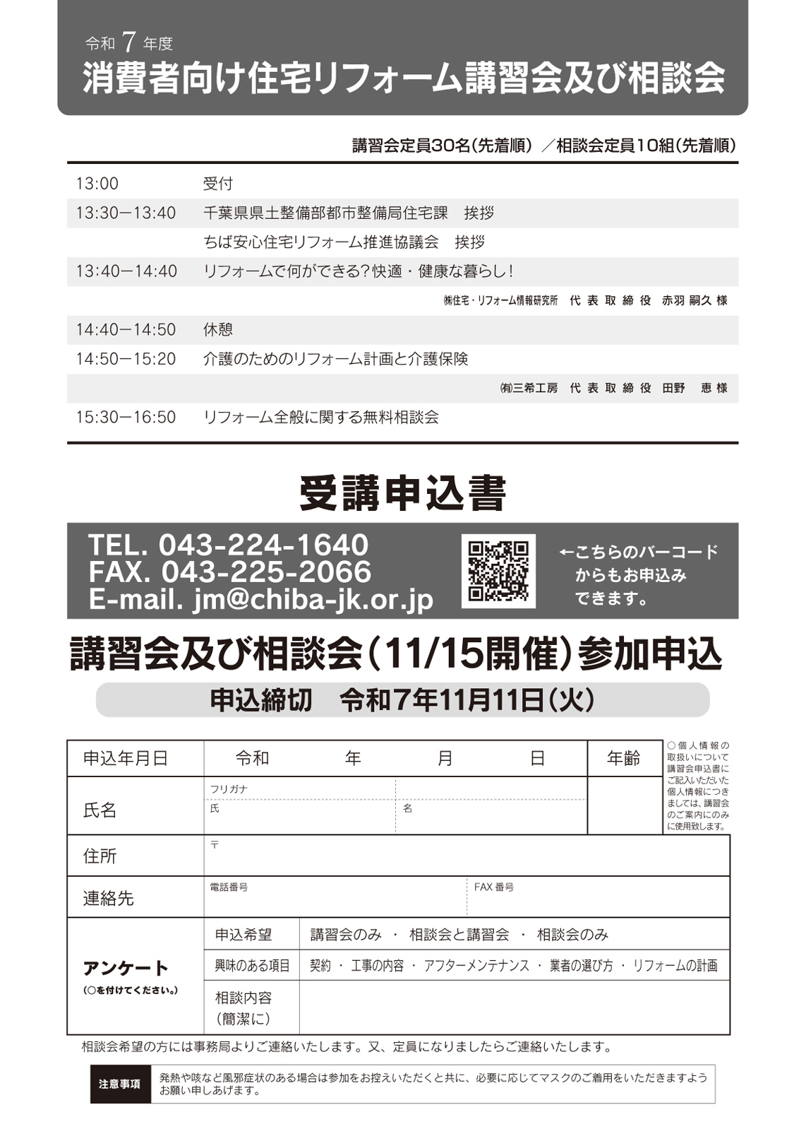 講習会・相談会のご案内 消費者向け講習会・相談会の予定告知 令和7年10月26日(日)開催分 令和7年11月15日(土)開催分 消費者向け住宅リフォーム講習会及び相談会 令和7年10月26日(日)開催分 印刷用PFDファイル 消費者向け住宅リフォーム講習会及び相談会 令和7年11月15日(土)開催分 印刷用PFDファイル